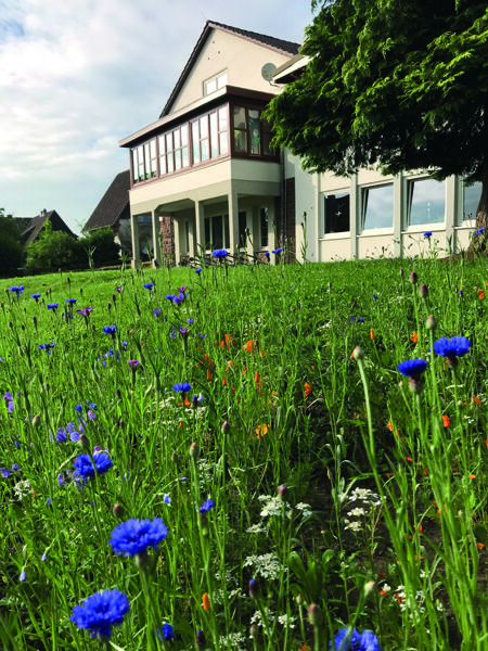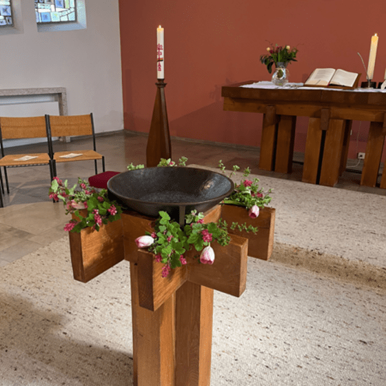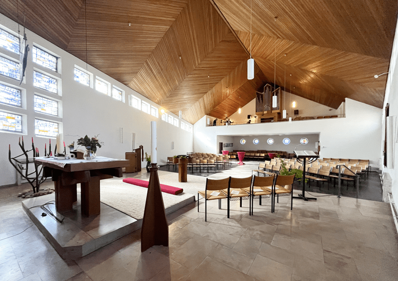 Schon vor Bau der Kirche gab es auf dem Gelände einen evangelischen Kindergarten, und im Untergeschoss ein Gemeindehaus. Ein Zuhause für zahlreiche Gruppen, Posaunenchor, andere Chöre, Konfirmand:innen. Inzwischen mit Solardach und Blühwiese davor.